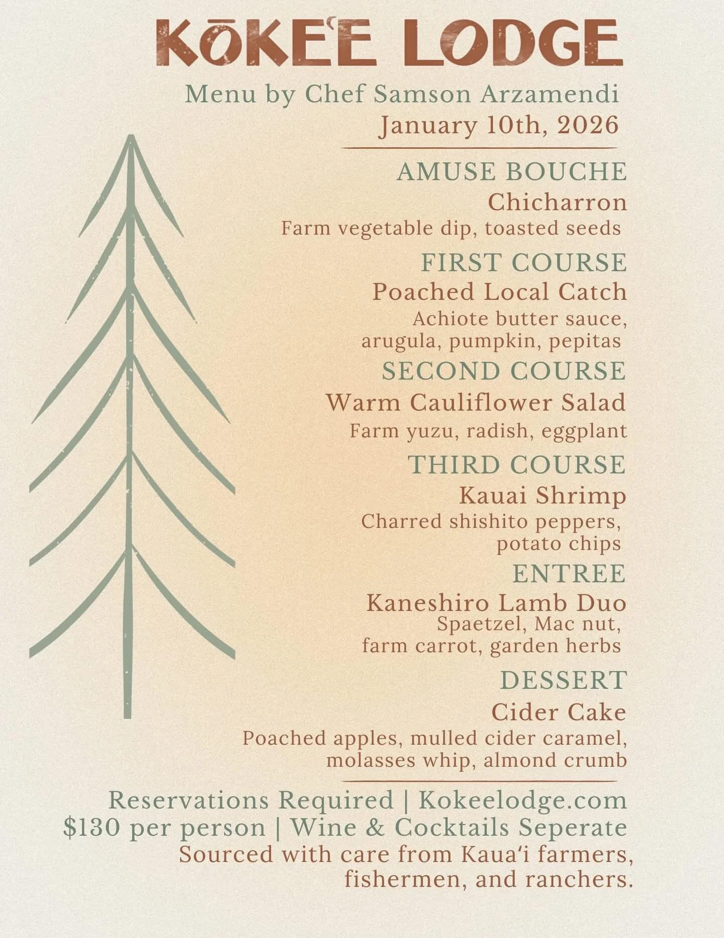 Welcome to Kōkeʻe Lodge, a historic lodge founded in 1950 and lovingly restored over generations for today’s travelers. Nestled in the cool Kanaloahuluhulu meadow of Kōkeʻe State Park, our lodge celebrates Hawaiʻi’s natural beauty and local heritage through a farm-to-table restaurant, a locally inspired gift shop, a cozy café, and rustic mountain cabin rentals. We work with over 50+ local farmers, fisherman, and purveyors to bring a farm to table experience to the mountain.